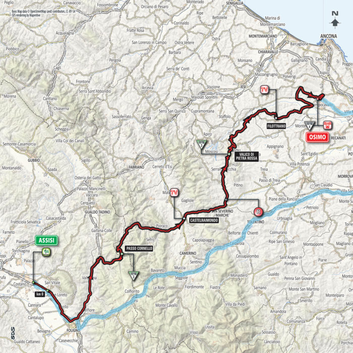 Pas le temps pour les coureurs de profiter de l’extraordinaire panorama d’Assise et de sa basilique qui a accueilli bon nombre de rencontres religieuses. De même à l’arrivée : les grottes d’Osimo ne seront pas vraiment au programme des rescapés de ce Giro. La 11e étape reliant les deux cités sera une nouvelle mini-classique, avec trois côtes répertoriées mais surtout une multitude d’ascensions qui vont casser le rythme. Sur seulement 156 kilomètres, cela risque de faire du dégât. Le plus intéressant pour les favoris sera surtout de ne pas laisser trop de champ à d’éventuels échappés, mais aussi de survivre aux deux murs qui clôtureront l’étape dans les six derniers kilomètres. D’abord, un passage pavé à 16 % à 5 kilomètres de la ligne, puis une dernière côte de 1 500 mètres dont un long passage à 16 % avant la flamme rouge. Les coureurs explosifs sont prévenus.