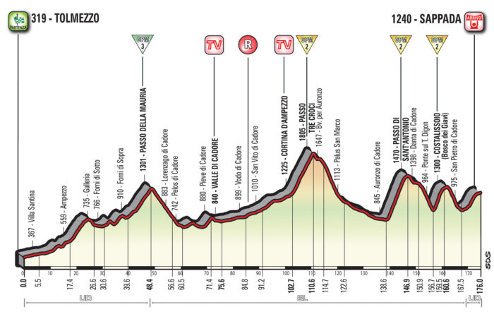 Au lendemain du Zoncolan, pas de repos pour les braves. Les rescapés du Giro vont affronter une nouvelle étape de montagne sans répit. Quatre cols répertoriés à affronter, ainsi qu’une arrivée en montée. Dans les Dolomites, il faudra surtout bien gérer ses efforts : même dans les vallées, il n’y aura pas vraiment de plaine. Vers Cortina d’Ampezzo, un long faux-plat montant attend les coureurs, avant l’enchaînement du Passo Tre Croci et du Passo di Sant’Antonio, et de Costalissoio, ces deux dernières ascensions proposant des passages très pentus à plus de 15 %. Les favoris pourraient donc mener quelques offensives sur ces pentes situées à moins de 30 kilomètres de l’arrivée.