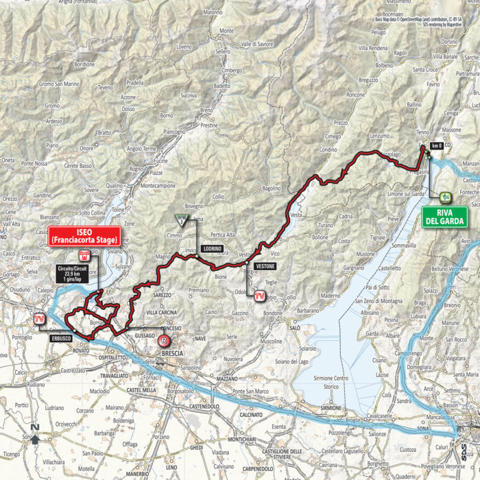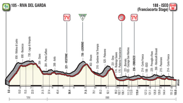 Depuis le lac de Garde, les coureurs auraient pu s’attendre à un mini-Tour de Lombardie. Mais cette étape courte (155 kilomètres) sera surtout l’occasion pour les sprinters de garder un peu de motivation pour cette dernière semaine de compétition qui s’annonce pour les grimpeurs. Si le départ se veut parfaitement adapté aux échappées avec une montée de 10 kilomètres dès le départ puis une ascension de 13 kilomètres vers Lodrino, la deuxième moitié de course se déroule dans la plaine. Et le circuit final d’Iseo ne propose pas de grande difficulté. Un sprint s’annonce donc.