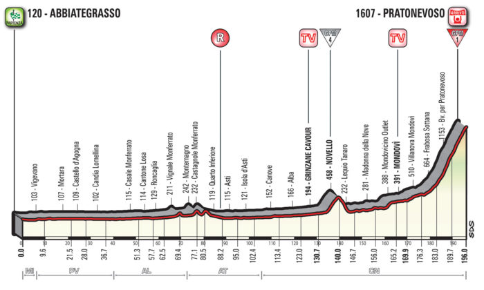 Une nouvelle course de côte à l’occasion de ce retour en haute montagne. Cette 18e étape vaudra avant tout pour sa montée finale vers la station de ski de Prato Nevoso. Le Giro n’y était plus passé depuis 2000 et le succès de Stefano Garzelli sur ces pentes pas si aisées. Ce sera surtout la première moitié de la montée qui sera la plus pentue, avec des passages à 10 %, avant un final moins ardu, avec une deuxième moitié à 6,6 % de moyenne. Une sorte d’apéritif avant les deux prochaines étapes dans la haute montagne alpestre.