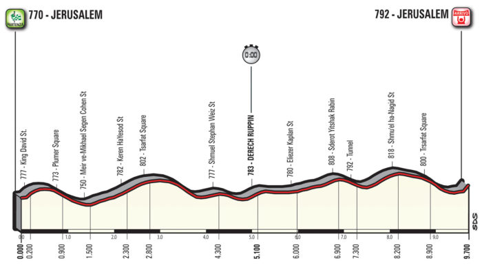 C’est ainsi un contre-la-montre de 9,7 kilomètres qui attend les coureurs de cette 101e édition du Giro, avec un tracé particulièrement vallonné dans les rues de la capitale israélienne. Le parcours est également sinueux et sera finalement parfait aux coureurs qui aiment les relances. Les passages les plus dangereux seront finalement la mi-course, avec une côte sinueuse durant laquelle quelques dizaines de mètres en descente peuvent surprendre les moins attentifs, et la finale avec une légère descente avant une remontée plus pentue (jusqu’à 9 %) pour conclure au sprint.