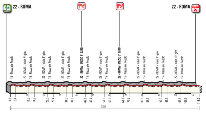 Comme en 2009, le Tour d’Italie délaisse Milan comme arrivée de la dernière étape et lui préfère Rome. Entre le Colisée, le Cirque Maxime et la Piazza del Popolo, les coureurs vont profiter durant cette dernière journée de course d’une visite des plus beaux monuments de la capitale italienne. Le circuit de 11,5 kilomètres à parcourir à dix reprises ne propose aucune difficulté et semble tout simplement promis aux sprinters. Pour conclure une belle édition du Giro.