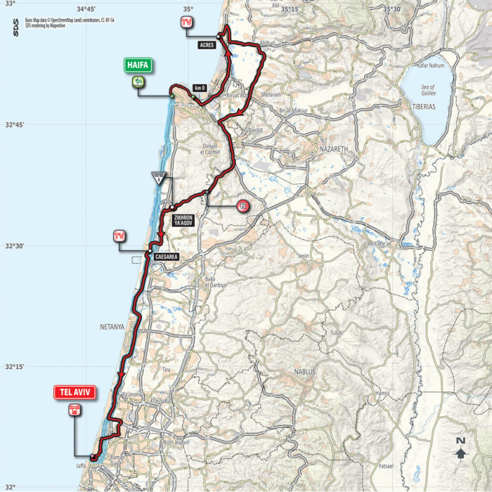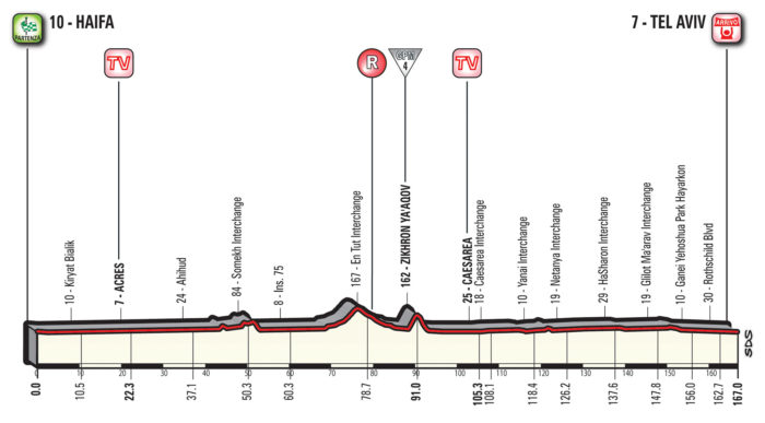 Entre Haifa et Tel-Aviv, la première étape en ligne du Giro n’aura pas grand-chose à proposer si ce n’est une longue journée pour les sprinters. La seule côte de la journée sera une petite colline à la mi-course, avec un infime passage à plus de 10 %, mais elle n’aura aucune incidence sur la suite de l’étape. Les routes seront larges, mais l’arrivée proposée risque de provoquer des tensions en tête du peloton. Trois virages à 90 degrés dans les trois derniers kilomètres, cela annonce une sacrée bataille… Heureusement, les 600 derniers mètres sont en ligne droite, sur une avenue très large.