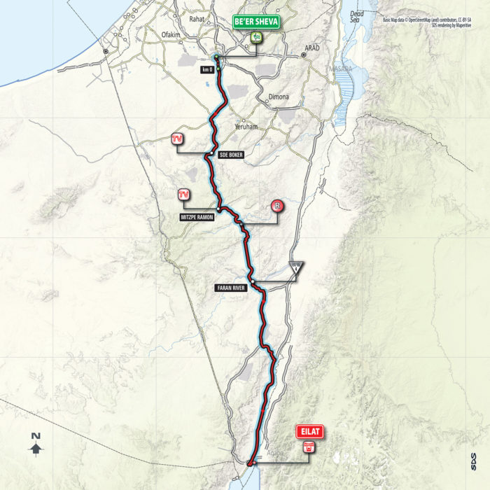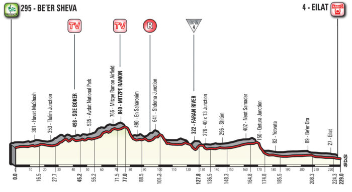 Même à l’intérieur des terres israéliennes, les sprinters ne devraient pas avoir trop de mal à dominer le final de cette étape. Dans le désert de Negev, quelques bosses sont à signaler dont la montée de la rivière Faran, à une centaine de kilomètres du but. Mais à l’approche de la Mer Rouge, cela sera plat. Attention toutefois aux routes empruntées dans les trois derniers kilomètres, dans le centre d’Eilat : les coureurs devront prendre un virage à 180° à 1 600 mètres du but avant un dernier virage à angle droit à 350 mètres de l’arrivée. Cela annonce un sprint virulent.