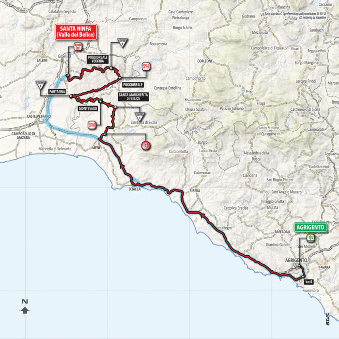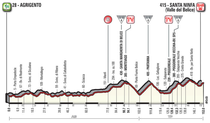 Depuis la cité d’Agrigento, fondée il y a près de 26 siècles, les coureurs vont cette fois découvrir le sud-est de la Sicile qui propose, comme la veille, des paysages naturels splendides mais aussi des côtes abruptes. Cette fois, l’étape sera plus courte (seulement 153 kilomètres) mais aussi plus intense. Dans la deuxième moitié de la course, les difficultés vont s’enchaîner et les dix derniers kilomètres devraient plaire aux habitués des classiques printanières. Attention toutefois à la descente étroite vers le centre de Santa Ninfa. Près du château de Rampinzeri, les coureurs fonceront à toute vitesse vers le haut de la ville via une côte de 1200 mètres à 6,1 % de moyenne, dont un passage à 12 %.