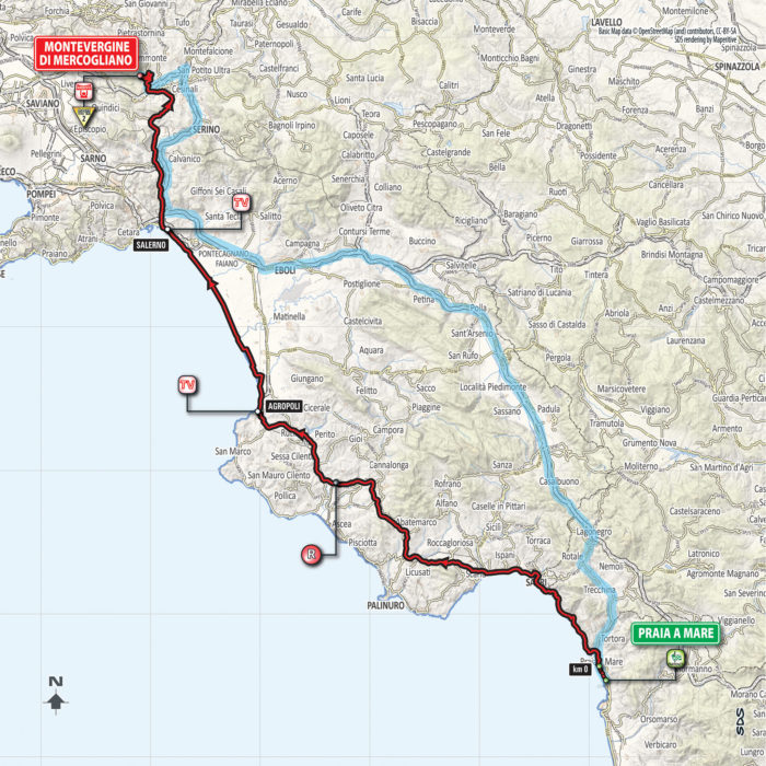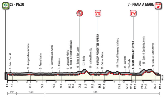 Cette courte étape de moins de 160 kilomètres pourrait être une longue traversée tranquille aux abords de la mer Méditerranée, avec un emballage massif annoncé à Praia a Mare. Mais à une dizaine de kilomètres de l’arrivée, les sprinters souhaitant reprendre le chemin de la victoire devront tenir le coup sur la petite colline de près de quatre kilomètres à 3-4 % de moyenne. Rien de bien compliqué, mais cela risque d’aller très vite si des attaques se lancent sur les hauteurs de Praia a Mare. Si un sprint s’engage tout de même, la dernière ligne droite de 1900 mètres, le long de la mer, ne devrait pas poser de problème majeur.