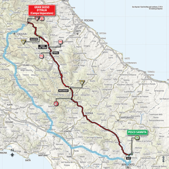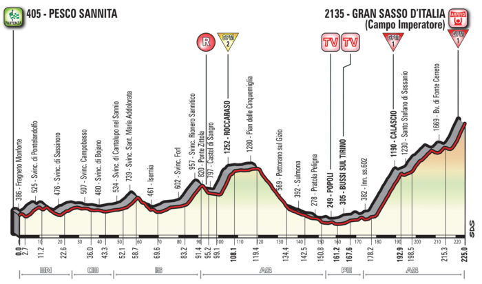 Il s’agira certainement de l’étape la plus compliquée de cette première semaine de course. Si la montée de l’Etna et de Montevergine permettront déjà aux grimpeurs de se faire les jambes tranquillement, cette étape vers Gran Sasso d’Italia sera l’une des plus longues et des plus éprouvantes dans son final. La première partie de l’étape vers la montée de Roccaraso rappellera des souvenirs aux coureurs qui ont déjà participé au Giro 2016, lors duquel cette ascension était une arrivée d’étape.