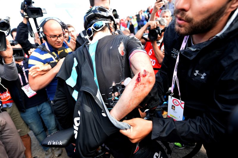 Cette chute ne coupait toutefois pas les espoirs de la Movistar qui poursuivait son effort, avec le consentement de l’organisation, qui n’indiquait aucune neutralisation malgré cette erreur manifeste d’un motard en première ligne de la course. Une faute humaine, qui aurait pu avoir des conséquences bien plus graves. Kelderman, victime d’une fracture de l’index, a dû se retirer de l’épreuve, alors que Thomas et Yates sont repartis avec plus de cinq minutes de retard, et plus de vingt-cinq minutes pour Landa. Sans compter les diverses blessures des coureurs tombés comme des dominos… Rien de « mortel », heureusement, mais la sanction est radicale pour ces coureurs qui espéraient jouer le maillot rose à armes égales.