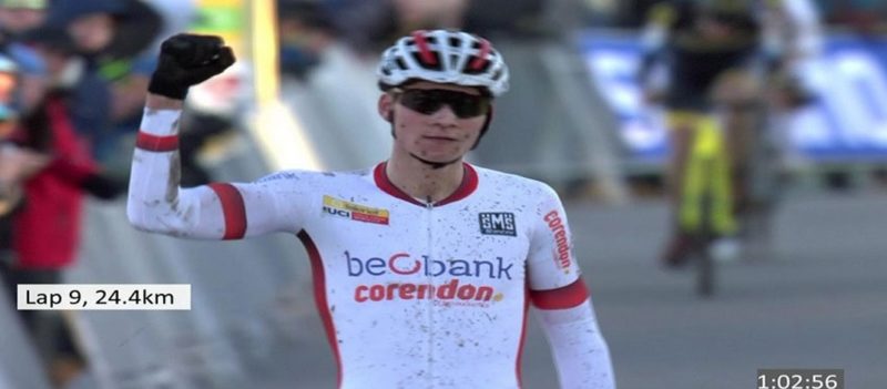 Alors que Van Der Poel faisait un dernier tour de sénateur, le sprint pour la seconde place revenait au champion du Monde, Van Aert, devant Aerts