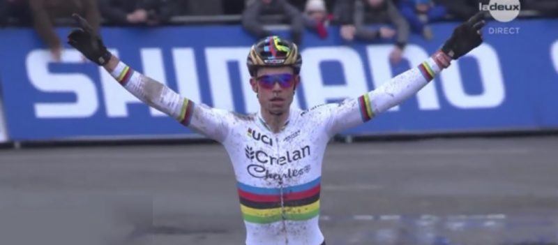 Van Aert prenait ainsi vingt, trente, quarante secondes et ne se retournait jamais, laissant une impression de puissance sur les routes escarpées de la Citadelle. Derrière, van der Poel était pour sa part moins fringuant et enchaînait les fautes techniques. L’ex-champion d’Europe Toon Aerts (Telenet Fidea Lions) en profitait pour rester dans la roue du leader de la Coupe du monde, mettant ainsi la pression sur un cycliste batave en difficultés. Ce dernier glissait ainsi une fois dans la fosse en dévers, avant de chuter dans le dernier tour dans une descente technique. Deux images qui résumaient parfaitement la journée difficile du Néerlandais. Alors que Wout Van Aert savourait sa revanche et célébrait, debout sur son vélo, sa deuxième victoire en Coupe du monde cette saison, et un succès de prestige face à un Van der Poel moins bien.