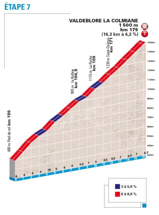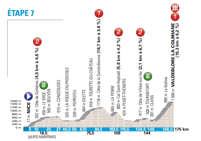 Le classement général se dessinera plutôt lors des quatre dernières étapes, en moyenne et haute montagne. La sixième étape vers Vence, notamment, ressemble furieusement à une mini-version de Liège-Bastogne-Liège, avec un enchaînement de courts cols qui vont bien casser les jambes, notamment dans les 15 derniers kilomètres. Le lendemain, les grimpeurs se disputeront la victoire sur la seule arrivée en montagne de la semaine, via le col de La Colmiane, déjà traversé l’année dernière. Enfin, la dernière étape, très courte, autour de Nice, fera office de juge de paix avec toutefois un tracé remanié, un col d’Èze réduit et un final via le Col des Quatre Chemins, comme en 2015.