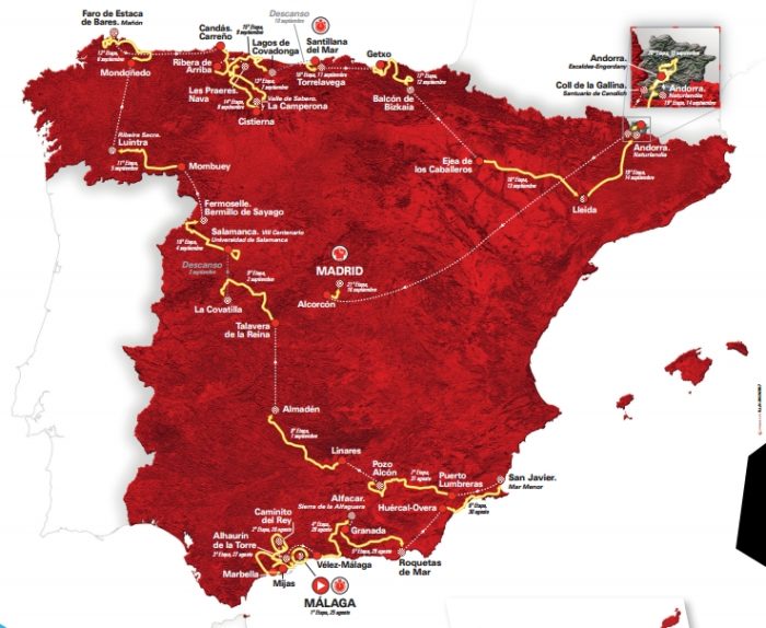 Pour la première fois depuis 2009, le Tour d’Espagne débutera par un court contre-la-montre individuel, dans les rues de Málaga. Encore une fois, c’est le sud de la péninsule ibérique qui offrira son terrain de jeu aux puncheurs après ce petit apéritif pour rouleurs. Ainsi, dès la deuxième étape, le peloton grimpera au sommet de Caminito del Rey, avec quelques pourcentages à deux chiffres, ce qui avait fortement plu au Colombien Esteban Chaves, vainqueur sur cette pente en 2015. Les reliefs seront ainsi nombreux mais bien moins difficiles que la saison dernière. La première moitié de course se voudra ainsi moins dangereuse, avec une première véritable journée en montagne prévue sur la quatrième étape sur la Sierra de la Alfaguara, avant le retour sur les hauteurs lors de la neuvième étape à La Covatilla, juge de paix de cette première semaine de course. C’est sur ce col que Bradley Wiggins et Chris Froome avaient dévoilé leurs qualités de grimpeur face à Juan José Cobo, en 2011.