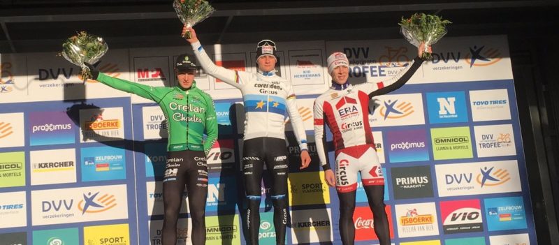 Van der Poel n’avait donc aucune concurrence et, malgré le bon retour de Tim Merlier (Crelan-Charles) et Laurens Sweeck (ERA-Circus) dans les deux derniers tours, allait conclure sa journée aux avant-postes par une 27e victoire cette saison et le succès au classement général du Trophée DVV, avec près de 9 minutes d’avance sur Toon Aerts (Telenet-Fidea). « Je ne vois pas cela comme une revanche du championnat du monde mais plutôt une preuve que je suis toujours bien », lançait le coureur batave de 23 ans à l’arrivée, sans grande trace de boue sur son maillot blanc. « Cela me fait plaisir de revenir à mon ancien niveau. Mais si vous m’aviez dit en début de saison que je pourrais gagner trente cyclo-cross, j’aurais directement signé des deux mains ». Wout van Aert continuait pour sa part de saluer le public et va visiblement profiter de cette fin de saison pour quelques tours d’honneur, avant de préparer Paris-Roubaix, son prochain grand objectif. « J’ai essayé de profiter de cette journée, j’ai donné ce que je pouvais mais je n’avais pas les jambes aujourd’hui », confirmait-il.