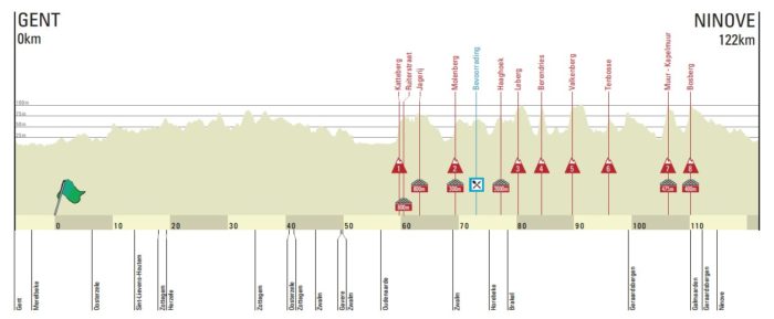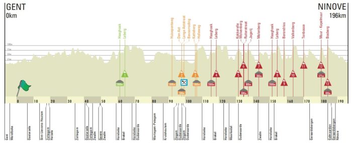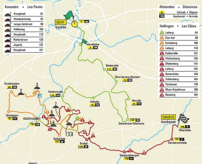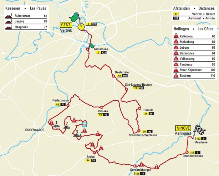 Treize côtes et huit secteurs pavés à avaler en moins de 120 kilomètres, cela risque de casser les jambes de quelques-uns qui n’auraient pas assez pris l’hiver au sérieux. Le nouveau parcours du Circuit Het Nieuwsblad se veut en effet plus ardu, et proposant moins de temps de repos entre les différentes difficultés à affronter. L’organisation a souhaité reprendre le concept de « mini-Tour des Flandres » sur la première classique du Nord de la saison, avec la reprise d’un tracé bien connu des habitués du Ronde, version 2000. Les coureurs ne feront en effet plus de boucle autour de Gand, qui empêchait les responsables de la course de trouver quelques côtes ou secteurs pavés décisifs aux alentours du chef-lieu de Flandre Orientale. Cette année, le peloton arrivera à Meerbeke, dans la commune de Ninove, avec les 60 derniers kilomètres exactement similaires au Tour des Flandres pré-2011, avant que l’arrivée soit transférée à Audenaerde, en plein centre des Ardennes flamandes.