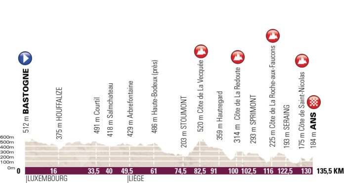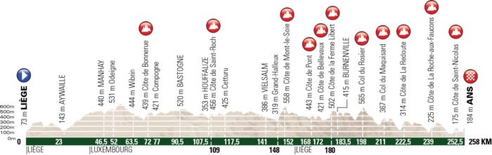 C’est notamment l’enchaînement des véritables murs que sont les côtes de Pont, de Bellevaux et de la Ferme Libert, à moins de 90 kilomètres de l’arrivée, qui peut permettre à des outsiders vaillants de lancer une offensive lointaine, du moins pour écrémer le peloton. Par la suite, c’est plutôt la côte de la Redoute qui doit faire une première différence, avant la côte de la Roche-aux-Faucons, et sa descente vers Seraing, où de nombreux coups sont déjà partis. Il restera enfin la côte de Saint-Nicolas à affronter, pour surtout éviter un sprint dans la dernière montée vers Ans.