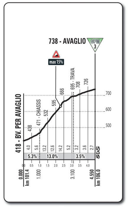 Km 106,0 – 3e cat. : Avaglio (4,6 km à 7%)