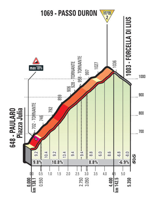 Km 142,5 – 2e cat. : Passo Duron (4,4 km à 9,6%)