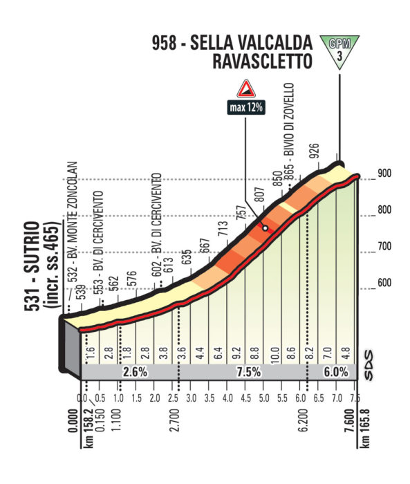 Km 165,8 – 3e cat. : Sella Valcalda-Ravascletto (7,6 km à 5,6%)