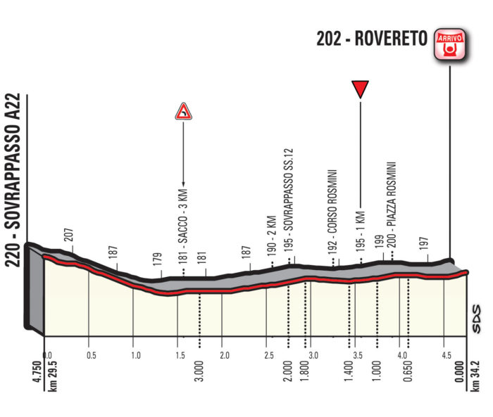 Dans le Trentin, ce ne sont pas les grimpeurs qui seront attendus mais plutôt les rouleurs ! Les spécialistes du contre-la-montre n’ont en effet eu droit qu’à un « prologue » de moins de 10 kilomètres à Jérusalem, et retrouvent seulement maintenant un nouvel effort en solitaire, en ouverture de la troisième semaine de course. Entre Trento et Rovereto, les routes ne seront pas forcément difficiles ou sinueuses. La partie la plus technique est signalée dans le final, avec une légère montée pour conclure, aux abords de Rovereto. Mais sur les 34,2 kilomètres prévus, difficile d’imaginer un coureur prendre les devants dans la course au maillot rose.