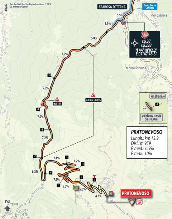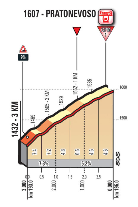 Une nouvelle course de côte à l’occasion de ce retour en haute montagne. Cette 18e étape vaudra avant tout pour sa montée finale vers la station de ski de Prato Nevoso. Le Giro n’y était plus passé depuis 2000 et le succès de Stefano Garzelli sur ces pentes pas si aisées. Ce sera surtout la première moitié de la montée qui sera la plus pentue, avec des passages à 10 %, avant un final moins ardu, avec une deuxième moitié à 6,6 % de moyenne. Une sorte d’apéritif avant les deux prochaines étapes dans la haute montagne alpestre.