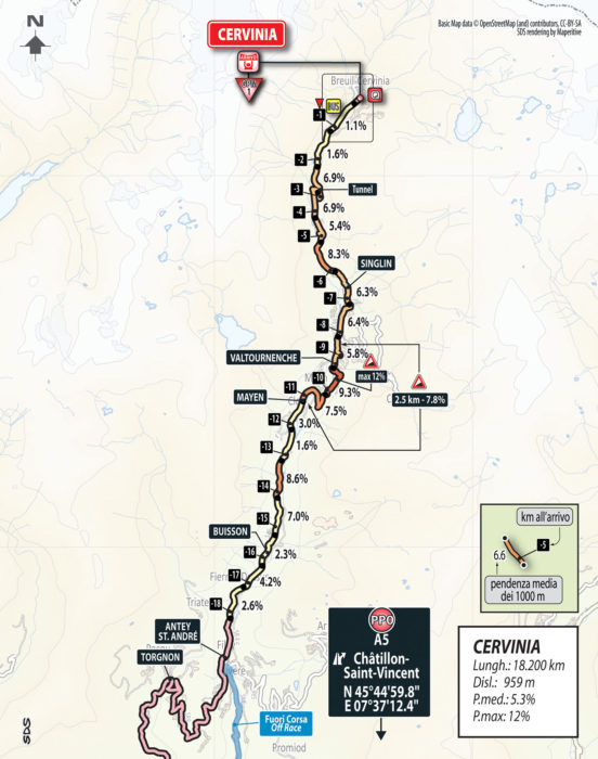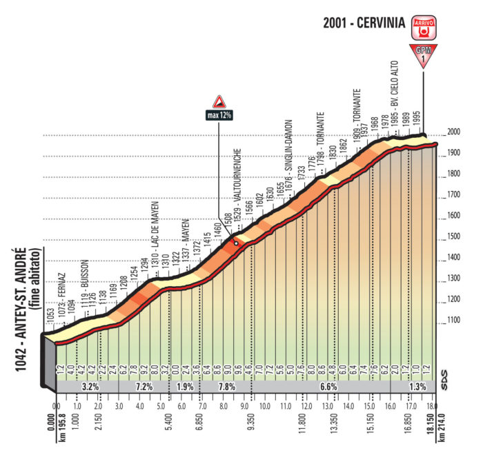 Km 214,0 – 1re cat. : Cervinia (18,2 km à 5,3%)