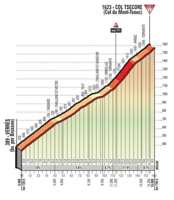 Km 146,5 – 1re cat. : Col Tsecore (16 km à 7,7%)