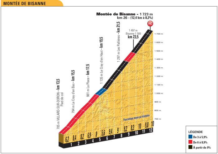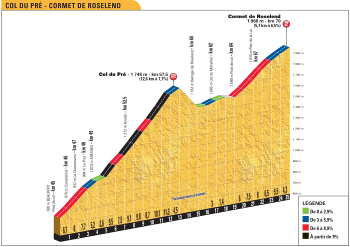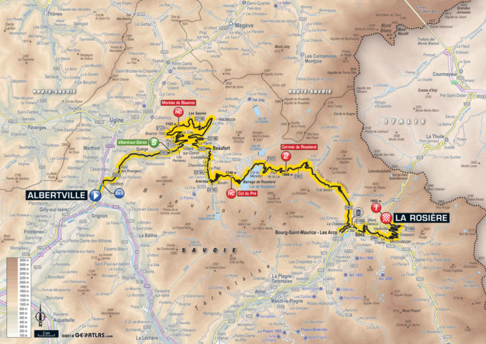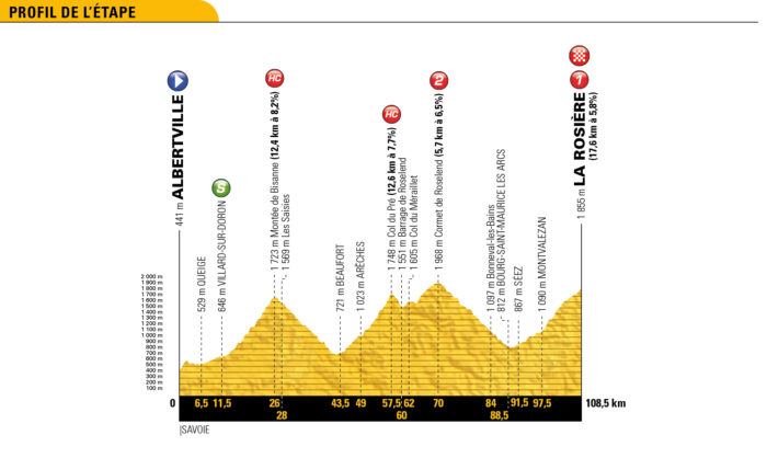 Le peloton enchaînera des ascensions pentues qui risquent clairement de faire éclater le peloton dès la Montée de Bisanne. Il découvrira ensuite le col du Pré, inédit sur le Tour de France avec quelques murs dans le final, et prolongé par le Comet de Roselend, dont la descente se veut particulièrement technique dans ses derniers kilomètres. La montée finale de La Rosière est longue mais se veut plus aisée et plus régulière. Au vu du rythme qui risque d’être imposé durant cette courte journée de course, l’ascension de la Rosière fera tout de même mal aux gambettes…