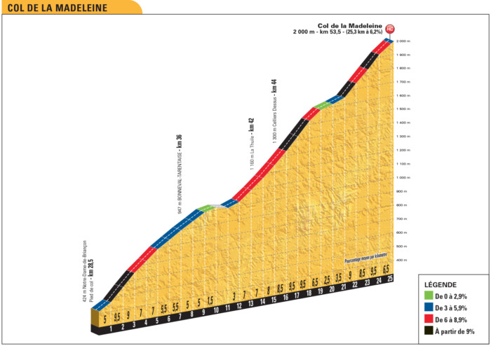 Km 53,5 – Hors-cat. : Col de la Madeleine (25,3 km à 6,2% de moyenne)