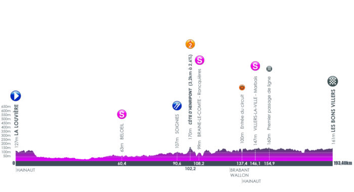 La première étape de ce Tour de Wallonie sourira d’abord aux sprinters, vu le profil particulièrement plat présenté dans le Hainaut. Entre La Louvière et Les Bons Villers, aucune grande difficulté ne sera vraiment présente pour bousculer les coureurs les plus rapides du peloton et seul le faux-plat montant dans le dernier kilomètre pourrait mettre à mal les ambitions de coureurs peu habitués aux grands plateaux.