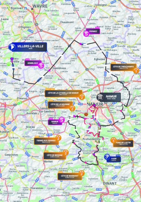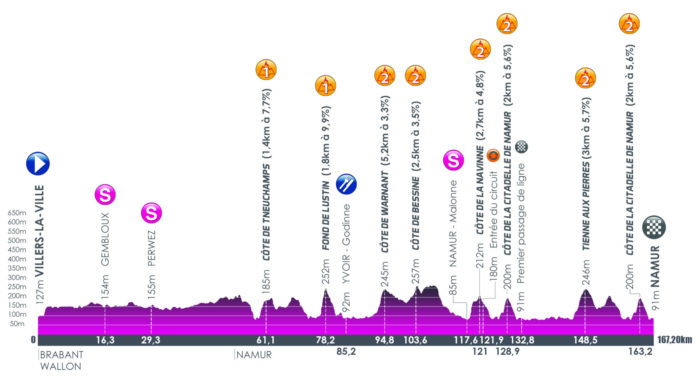 La deuxième étape donnera déjà le ton général de ce Tour de Wallonie avec un circuit final autour de Namur qui risque de mener déjà un grand chamboulement dans le classement général. Les habitués du Grand Prix de Wallonie y retrouveront des routes familières, avec les habituelles côtes de la vallée mosane à affronter avant la montée vers la Citadelle de Namur, une des plus belles ascensions du sud du pays. Toutefois, les coureurs ne devront pas grimper une mais deux fois le point culminant de la capitale wallonne, avant de redescendre vers le centre-ville où la ligne d’arrivée est tracée au terme d’une descente sinueuse. Le final se veut donc technique et il faudra donc compter une bonne quinzaine de secondes d’avance au sommet de la Citadelle pour croire au succès d’étape.