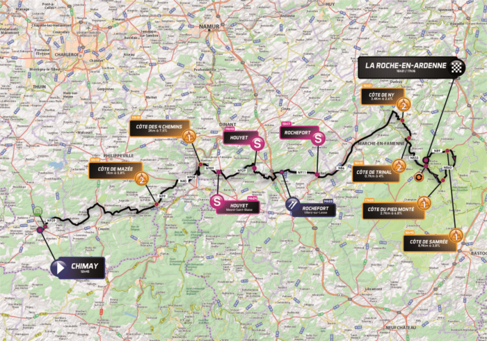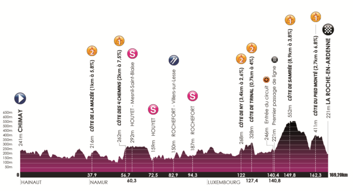 La troisième étape sera également taillée pour les habitués des fortes pentes avec un final très ardu entre Chimay et La Roche-en-Ardenne. Même si les côtes ne seront pas légion en début de journée, le terrain sera très vallonné et ne proposera que de très rares passages sur le plat. De quoi bien chauffer les cuisses avant le final et ses deux côtes en moins de trente kilomètres autour de La Roche. Si la côte de Samrée fera office de mini-col (six kilomètres de montée en Belgique, c’est rare), ce sera surtout la côte de Pied Monté et ses passages à 12% qui pourront aider les puncheurs à faire la différence avant la descente rapide sur les pentes de la côte de La Roche-en-Ardenne, d’habitude empruntée dans l’autre sens lors de Liège-Bastogne-Liège.