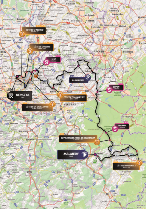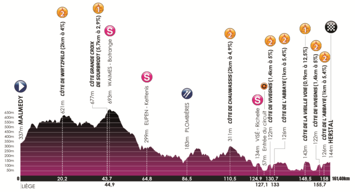 La quatrième étape sera l’étape ardennaise de ce Tour de Wallonie. Comme la veille, le peloton ne sera jamais tranquille sur ces toboggans de la province de Liège. Les premiers kilomètres se feront sur les hauteurs, avant le retour dans la vallée mosane qui va permettre aux coureurs les plus explosifs de se faire les dents sur les quelques côtes menant vers Herstal. Attention notamment à la côte de la Vieille Voie et ses passages à 15%, et la côte de Vivegnis (jusqu’à 10%) qui risquent de faire la différence dans les 15 derniers kilomètres.