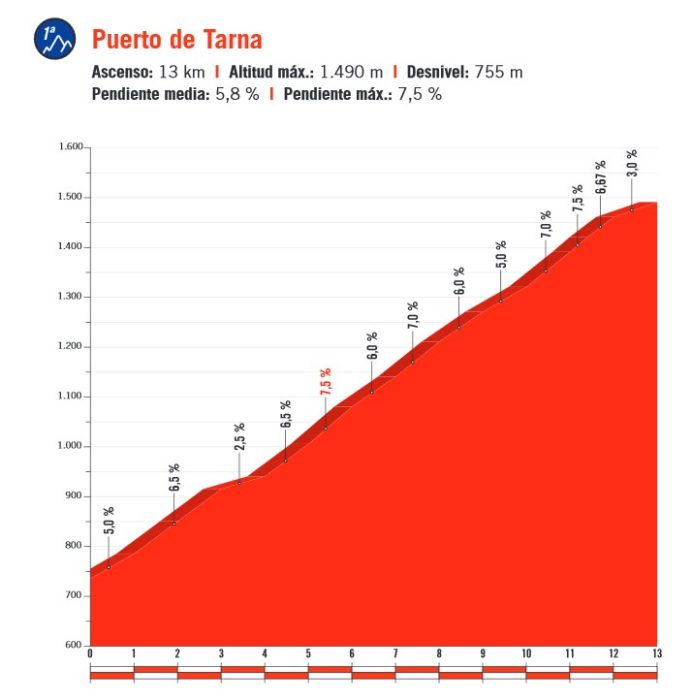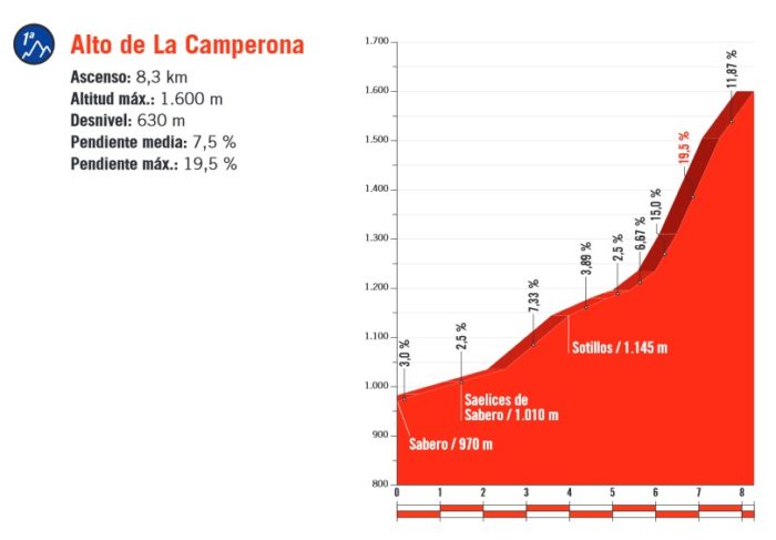 Cette première étape de montagne dans la cordillère cantabrique aura toutefois des airs de course de côte, tant le profil semble profiter à une échappée, alors que les favoris patienteront plutôt jusqu’à la dernière ascension, l’Alto de la Camperona, vu que le seul autre col répertorié de la journée se situe à plus de 70 kilomètres de l’arrivée. La bataille se fixera donc dans l’Alto de la Camperona, une ascension abrupte qui propose dans les deux derniers kilomètres une pente moyenne à près de 16%, avec plus de 500 mètres à 19%. Un enfer qui risque de créer de sacrés écarts en vue du classement du maillot rouge.