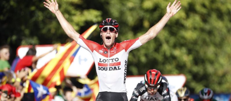 Sur cette 18e étape qui semblait destinée aux sprinters, le peloton a mal cerné le groupe de tête. Partis dès le premier kilomètre, Wallays, Sven Erik Bystrøm (UAE Team Emirates) et Jetse Bol (Burgos-BH) parvenaient à garder plus de trente secondes d’avance à sept kilomètres de l’arrivée, moment que le Belge choisissait pour attaquer avec Bystrøm. Les deux hommes tenaient bon face à un peloton désorganisé et dans le dernier kilomètre, Wallays restait bien dans la roue de son rival norvégien, sur le faux-plat montant vers l’arrivée, pour lancer son sprint aux 200 derniers mètres et ainsi remporter l’un des plus beaux succès de sa carrière, juste devant le peloton mené par le champion du monde Peter Sagan (Bora-Hansgrohe). Rien que ça. « J’avais coché cette étape ! J’avais l’ambition de gagner sur cette Vuelta et j’avais quatre étapes en tête, celle-ci était l’une d’elle », confirmait le sociétaire de Lotto-Soudal à l’arrivée. « Ce n’était pas facile de prendre l’échappée au départ. Je n’avais pas de super jambes, mais je suis un diesel et plus nous amassions les kilomètres, mieux je me sentais. Je n’avais pas l’impression d’être non plus le plus fort de l’échappée, mais je sais que je peux finir fort après une longue journée dans l’échappée, ce que j’ai encore prouvé aujourd’hui. Le vent était aussi à notre avantage, donc nous avons pu rouler à une sacrée vitesse. Hier, aussi, j’avais changé mon plateau pour rouler plus vite sur cette étape. Je pense que dans les 15 derniers kilomètres, on a maintenu une vitesse moyenne de 50 km/h ».