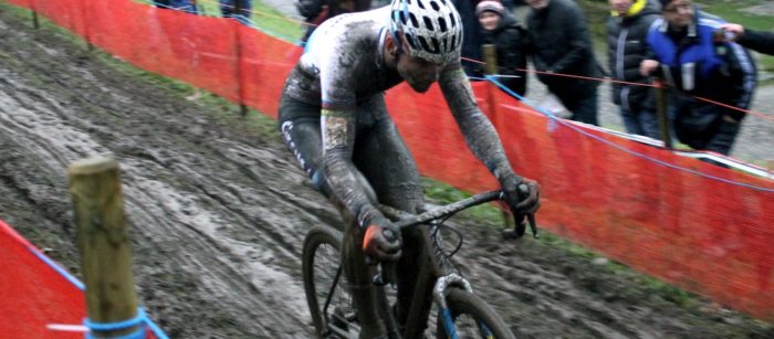 Pour la 17e fois cette saison et la quatrième fois consécutive en Coupe du monde, le champion d’Europe Mathieu van der Poel (Corendon-Circus) a dominé de bout en bout les débats ce dimanche. À Namur, sur un parcours technique et particulièrement boueux, face à la pluie qui n’a cessé de s’abattre tout au long de la journée, rien n’a arrêté le Néerlandais. Certes, dès le premier tour, il se retrouvait à batailler dans les ornières avec Laurens Sweeck (Pauwels Sauzen-Vastgoedservice), Michael Vanthourenhout (Marlux-Bingoal) et Toon Aerts (Telenet Fidea Lions) notamment. Alors que Wout van Aert (Cibel-Cebon) était relégué au second plan après un mauvais départ. Mais cela ne durait qu’un temps. Dans le troisième tour, Van der Poel accélérait comme à son habitude, prenait plus de risque dans les descentes pentues de la Citadelle, et prenait l’ascendant. Aerts, dans son maillot (ou presque) de leader de la Coupe du monde, tentait d’assurer le rythme derrière son rival batave, mais une chute dans le célèbre dévers en bas du parcours, l’empêchait d’encore croire à la victoire.