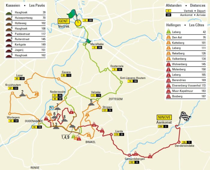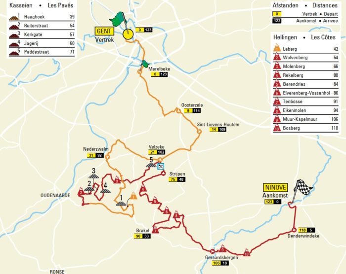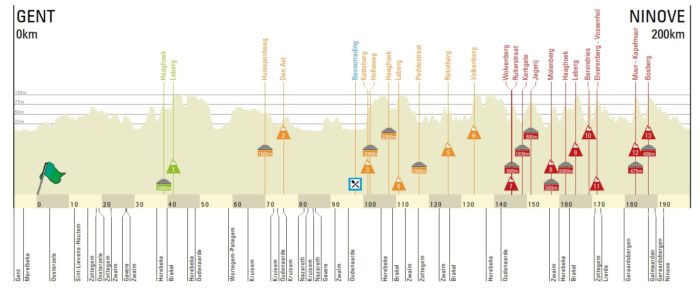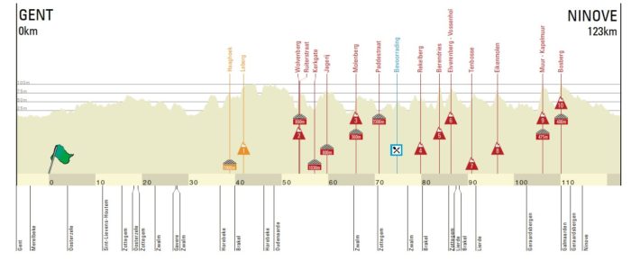 Cette 74e édition du Circuit Het Nieuwsblad a connu quelques changements par rapport à l’an dernier. Après un déménagement du côté de Meerbeke qui n’a pas été jugé concluant (malgré la victoire en solo de Michael Valgren devant un peloton encore bien large), la direction de course a décidé de déplacer l’arrivée de cette première course belge de l’année dans le centre de Ninove, quelques kilomètres plus loin, pour favoriser une course plus tactique d’ici la ligne d’arrivée. Mais ce n’est pas la seule nouveauté. Depuis le départ du Kuipke de Gand, le célèbre vélodrome de la cité flandrienne, les coureurs vont entrer rapidement dans le vif du sujet avec le premier des trois premiers passages sur le secteur pavé du Haaghoek après seulement 38 kilomètres de course, suivi d’une ascension sur le Leberg, une ascension qui va surtout user les gambettes avec son petit kilomètre à plus de 4% de moyenne. L’objectif de l’organisation est surtout de fatiguer les organismes, pour éviter une course d’attente vers Ninove.
