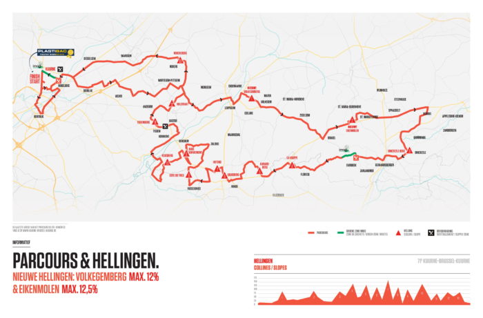 Si le parcours de Kuurne-Bruxelles-Kuurne semble plus aisé que le Circuit Het Nieuwsblad, disputé la veille, la semi-classique flandrienne multiplie les nouveautés pour permettre une course de mouvements. Si ce ne sont Bobbie Traksel (en 2010, lors d’une édition épique dans des conditions hivernales) et Jasper Stuyven (en 2016, au bout d’un beau solo dans le circuit local), les sprinters ont souvent trouvé la bonne formule pour annihiler les offensives dans les derniers kilomètres de cette épreuve qui fait la part belle aux longues et larges chaussées bordées par le vent. Difficile donc pour les hommes seuls ou en petit comité de se débarrasser d’un peloton bien plus organisé. Alors, l’organisation a décidé pour cette édition 2019 de corser les choses. D’abord en ajoutant le Volkegemberg et l’Eikenmolen pour émousser les coureurs à l’aube de l’enchaînement dans les côtes flandriennes habituelles, avec le Vieux Quaremont comme grand test pour les sprinters, s’ils espèrent trouver la victoire près de 80 kilomètres plus loin.