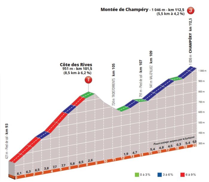 La dernière étape sera particulièrement courte (seulement 113,5 kilomètres) mais ne laissera aucune minute de répit aux survivants. L’enchaînement de la côte des Rives (8 bornes à 6,2% de moyenne) et de la montée vers la station suisse de Champéry annonce une bataille finale avec les battements cardiaques au plus haut. Bref, ce sera du costaud pour conclure cette répétition générale en vue du Tour.