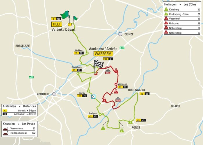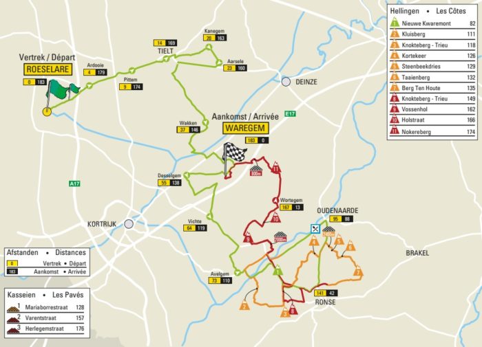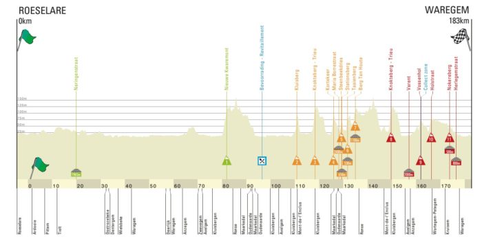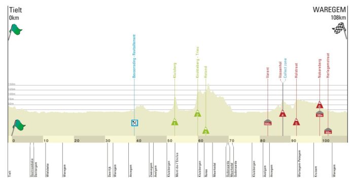 Avec seulement 182 km au programme, À Travers la Flandre paraît bien « simple » par rapport aux autres grandes classiques flandriennes à affronter depuis une semaine. Et pourtant, l’épreuve s’annonce intense avec 12 côtes et 3 sections pavées à affronter dans les 100 derniers kilomètres. Le début de course peut toutefois favoriser les bordures avec de larges chaussées et un vent qui soufflera de côté. Puis la course dans les collines flandriennes pourra commencer.
