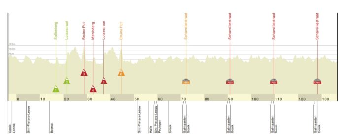 Le juge de paix de cette course reste toutefois le circuit final autour d’Overijse qui n’a pas bougé d’un iota. Les coureurs devront se farcir trois circuits et demi, avec notamment le Schavei comme côte idéale pour les puncheurs, à moins de 200 mètres de la ligne d’arrivée. La pente est à près de 9% au pied de cette ascension finale, à grimper quatre fois sur la course, alors que son final est une vraie rampe en faux-plat montant. Il faudra donc être costaud pour sortir dans cette montée et devancer le sprint. Et pour ceux qui aiment l’offensive, on leur conseille l’Hertstraat, et sa longue ligne droite pavée à 8% de moyenne, ou encore l’Ijskelderlaan, à moins de 5 kilomètres du but et dont les quelques pavés peuvent aussi aider ceux qui aiment le gros braquet et les risques, avec cette descente sinueuse qui suit jusqu’à Overijse. Bref, même si le profil ne présente pas de grandes ascensions bien longues, les coureurs ne connaîtront jamais de répit sur ces cuvettes incessantes.