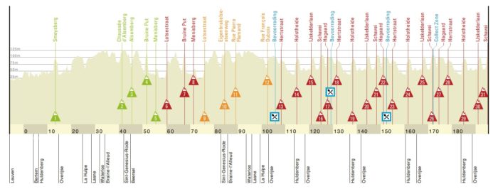 Désormais rendez-vous traditionnellement marqué par les côtes de la région d’Overijse, la Flèche Brabançonne connaît cette année un petit changement qui risque de corser la course. Les coureurs devront une nouvelle fois grimper près de trente côtes sur l’ensemble de l’épreuve (même si la plupart de ces ascensions ne seraient même pas répertoriées sur une étape du Tour de France), mais le tracé a connu une modification importante du côté d’Alsemberg, ancien site d’arrivée de la semi-classique brabançonne. Cette fois, le peloton tournera deux fois autour d’Alsemberg, avec deux passages par le Bruine Put ou le Menisberg, des petites buttes qui peuvent attiser l’appétit des attaquants si une décision n’a pu être menée lors de la descente vers Braine-l’Alleud.
