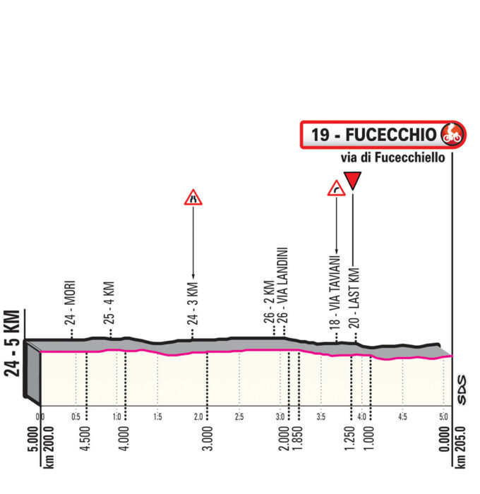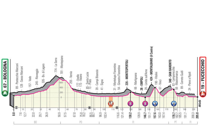 Les coureurs traversent en effet les Apennins mais ne vont pas vraiment enchaîner les sommets. Dans les cinquante derniers kilomètres, ils titilleront tout de même deux côtes qui alimenteront les offensives de puncheurs motivés, mais au vu des dix derniers kilomètres, les sprinters auront tout de même un bel avantage. Il y aura bien quelques virages dans les trois derniers kilomètres, mais les trains de sprinters peuvent se mettre en marche malgré ces difficultés.