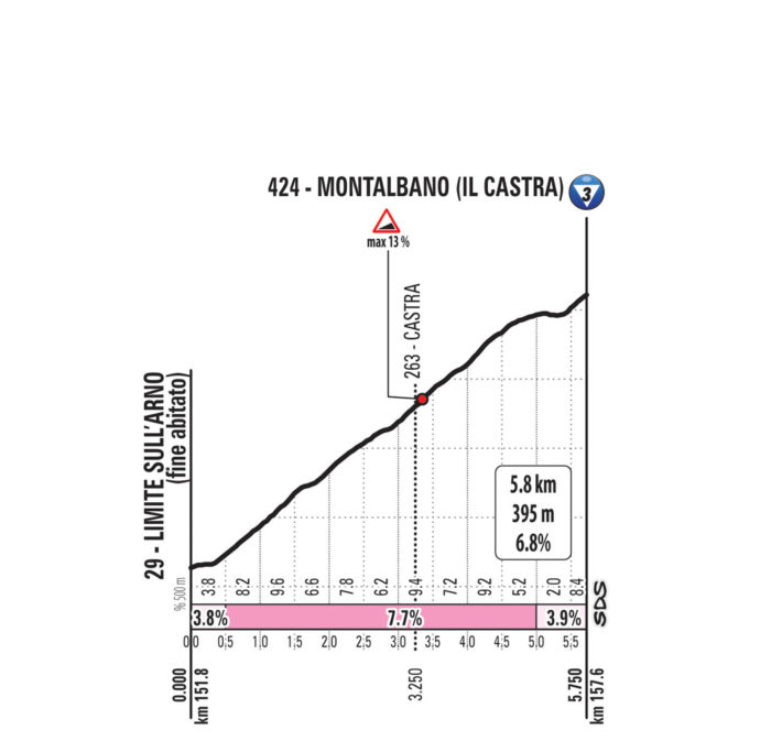 Km 151,8 – 3e cat. : Montalbano/Il Castra (5,8 km à 6,8% de moyenne)