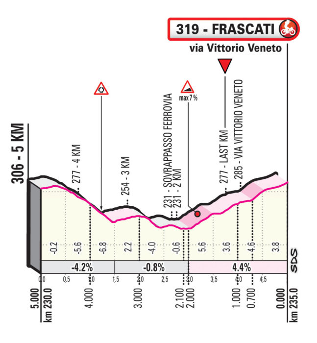 Les coureurs vont littéralement contourner Rome pour faire le spectacle dans les collines de la région du Latium, dont les plus anciens se souviennent de la classique qui se clôturait à l’époque dans la capitale italienne. C’est ainsi à travers les vignobles de la région que le peloton va affronter un festival de toboggans jusqu’à Frascati. La montée finale sera toutefois accessible aux sprinters qui savent franchir les pentes en puissance puisque les deux derniers kilomètres sont à 4,4% de moyenne, avec un dernier kilomètre plus aisé encore. Il faudra donc s’accrocher pour jouer la victoire dans un sprint groupé.