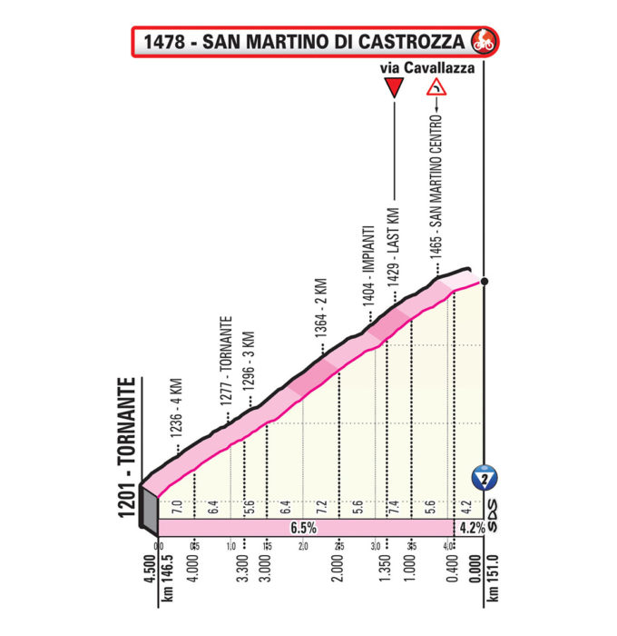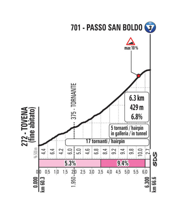 Cette journée sera une nouvelle fois intense au vu du profil, même si les favoris devraient surtout se dévoiler lors de l’ascension finale de San Martino di Castrozza. Avant cela, les téléspectateurs se délecteront des images de la montée du Passo di San Boldo, enchaînement d’épingles dans des tunnels construits lors de la Première Guerre Mondiale. Le final n’offre par contre pas de grande difficulté par rapport aux précédentes arrivées en altitude. L’ascension vers San Martino di Castrozza est en fait la première partie du Passo Rolle et ne dépasse pas les 6,4% de moyenne.