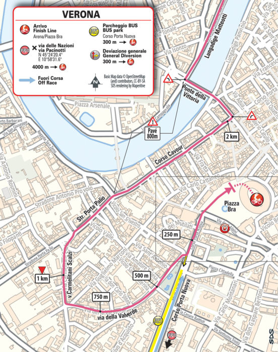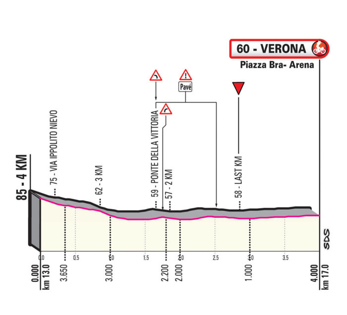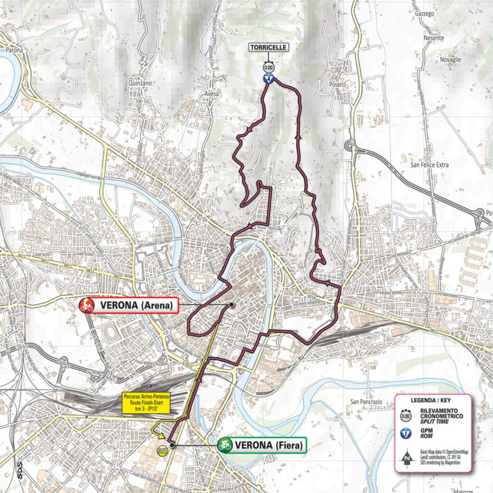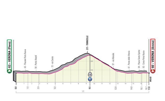Pour promettre un suspense inédit jusqu’à la dernière étape, l’organisation a prévu un nouveau chrono vallonné dans les rues de Vérone. Les coureurs devront en effet franchir, au nord de la ville, la montée de Torricelle, habituelle ascension des championnats du monde organisés par le passé dans la cité vénitienne. Le final sera plus technique et au bout des 17 kilomètres chronométrés, les coureurs auront droit à une arrivée spectaculaire dans l’amphithéâtre romain.