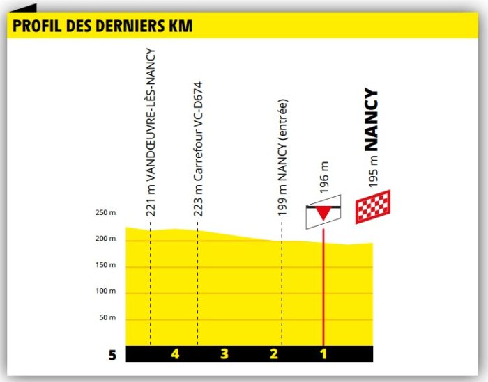 Cette quatrième étape sera en effet de plaine, avec la seule côte de Maron (3,2 km à 5%) à quinze kilomètres de l’arrivée pour bousculer un peu le peloton. Mais rien pour vraiment surprendre les équipes de sprinters qui se mettront ensuite en marche vers le centre de Nancy. Un emballage massif s’annonce bien au bout de ces 213 bornes, avec une longue ligne droite en légère descente de 1400 mètres pour conclure.