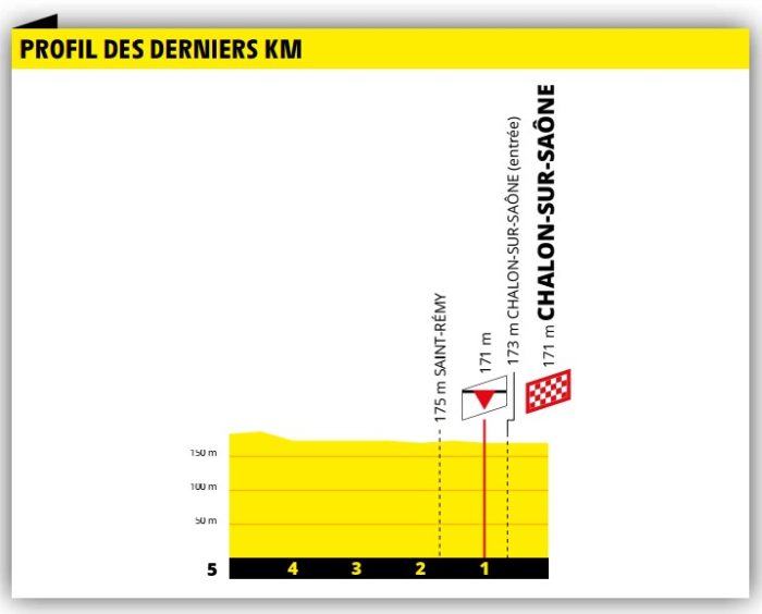Quelques côtes en début d’étape pour permettre aux candidats au maillot à pois et baroudeurs de faire la différence, avant de longues routes sans difficulté jusqu’à Chalon-sur-Saône. Le sprint final sera toutefois intéressant à suivre vu les virages serrés à affronter à 2600 m et à 1600 m de l’arrivée.