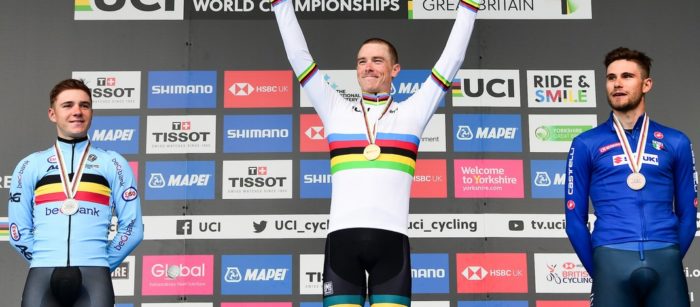 La victoire revient donc au surprenant Rohan Dennis, auteur d’une année difficile et qui n’avait plus retrouvé la compétition depuis son départ soudain du Tour de France. À l’époque, l’Australien était parti en dispute avec Bahrain-Merida, abandonnant sans raison apparente avant de se retrouver sans autre contrat. Dennis aurait quitté l’équipe en raison de problèmes avec les vélos de contre-la-montre de la marque Merida. Le champion du monde en titre était d’ailleurs ce mercredi à Harrogate avec un vélo… BMC, comme celui de son ancienne formation. Et cela l’a mené à un deuxième maillot arc-en-ciel consécutif, et avec la manière en prime, débordant Campenaerts et Primoz Roglic (Jumbo-Visma) en près de 50 kilomètres.