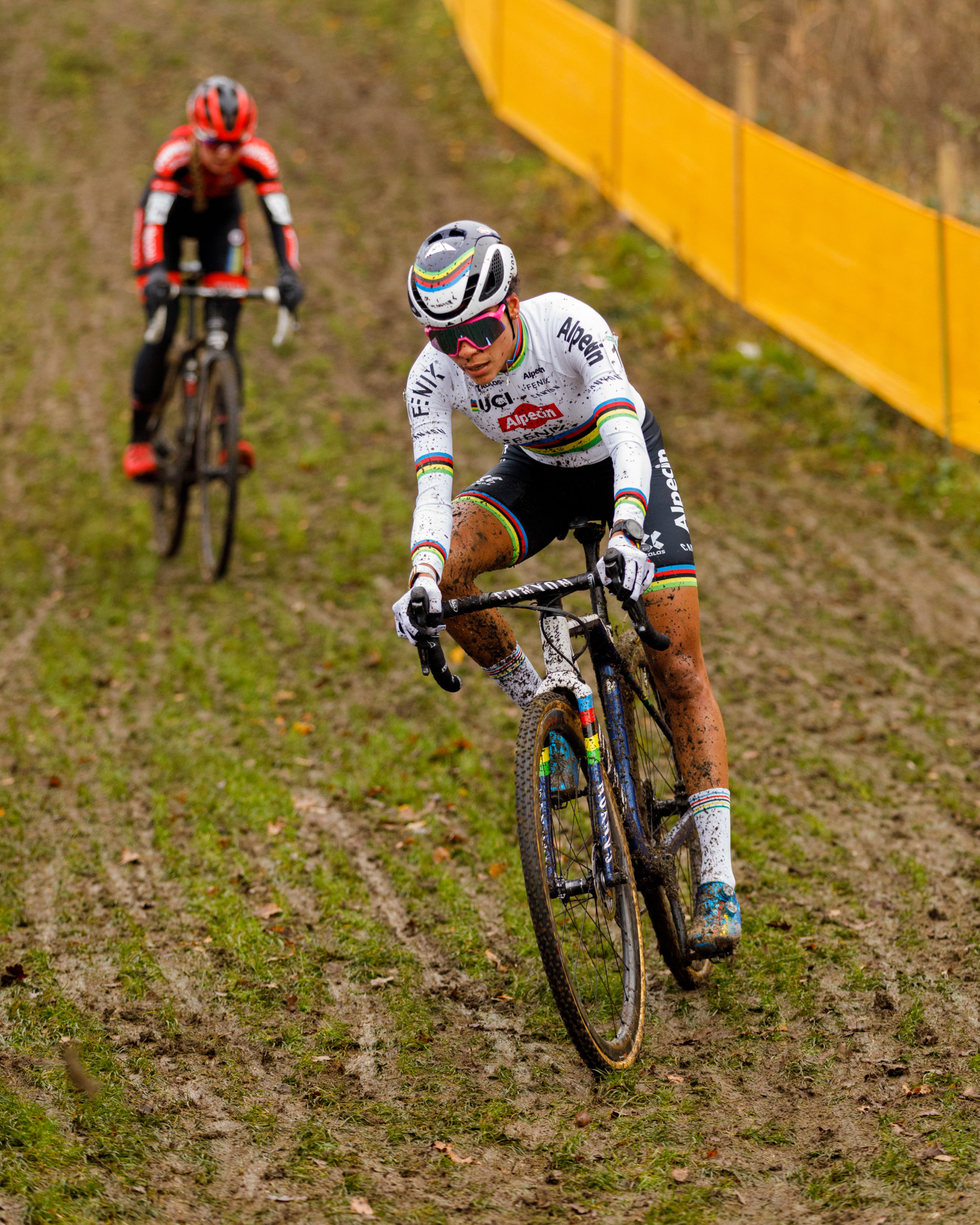 Sur ce parcours particulièrement ardu, rendu encore plus technique par une boue glissante et humide, l’important était de se placer aux avant-postes dès le départ. Au grand dam de Wout van Aert (Jumbo-Visma), toujours coincé en troisième ligne et rapidement délogé de sa position pour se retrouver au-delà de la 25e place après les premiers virages. Le N.1 belge de la dernière saison sur route profitait des montées abruptes pour faire parler son explosivité et revenir dans le Top 10, des efforts qui allaient certainement se payer quelques tours plus tard.